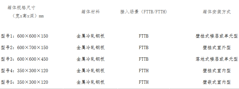 產(chǎn)品主要技術(shù)指標:廠商應(yīng)具備報名產(chǎn)品中所有規(guī)格和型號的生產(chǎn)及供貨能力方可參與產(chǎn)品的投標。寬帶接入用綜合配線箱的采購型號見下表: