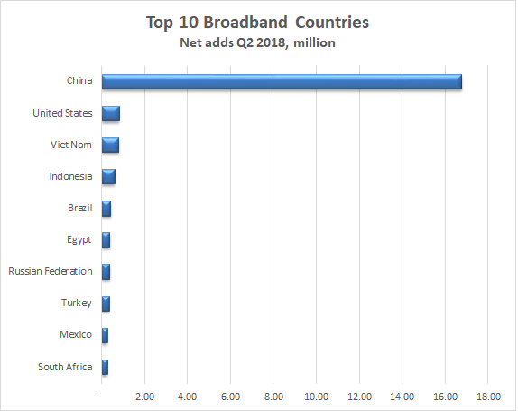 Q218是過去六個季度增長率最高的一個季度,主要是由于東亞的增長趨勢提供了固定寬帶用戶凈增量的70%。