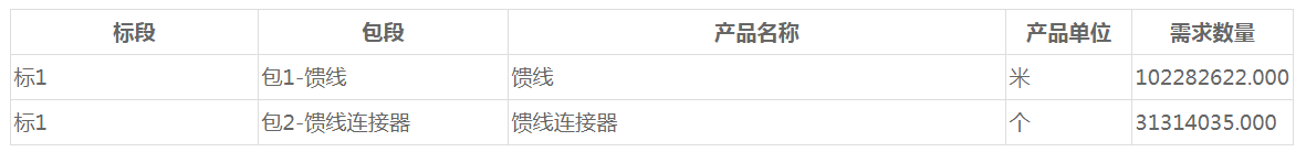 標(biāo)包1饋線招標(biāo)規(guī)模約為102282622米,中標(biāo)人數(shù)量為6至8家,分配標(biāo)包及份額具體如下: