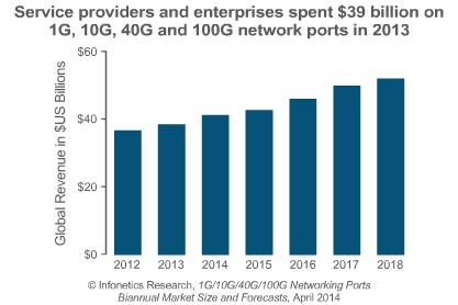 Infonetics 企業(yè)網(wǎng)絡(luò)和視頻分析師Matthias Machowinski稱:“2013年1G、10G、40G和100G端口的部署顯著增長(zhǎng),主要由于企業(yè)和服務(wù)提供商為了應(yīng)對(duì)流量需求的增長(zhǎng)而投資于它們的網(wǎng)絡(luò)建設(shè)。同時(shí),由于用戶從低寬帶轉(zhuǎn)移到更高的寬帶,相應(yīng)的付更多的費(fèi)用,從而促使該市場(chǎng)收入增長(zhǎng)加速。”