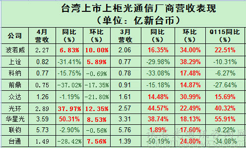 ICCSZ訊(編輯:Debi)近日,臺灣上市/上柜光通信廠商紛紛公布2015年4月運(yùn)營情況,同比、環(huán)比多下滑,幾乎配得上“寡淡”二字,二季度開篇似乎出師不利,以下進(jìn)行簡單分析。