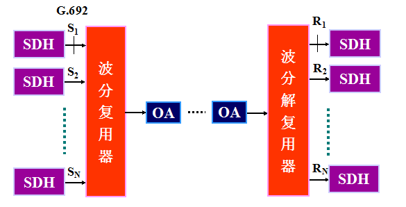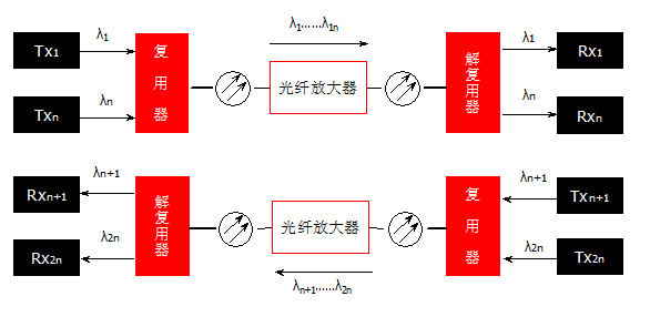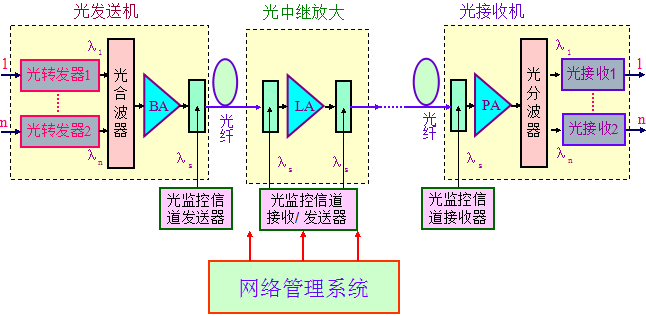 WDM系統(tǒng)主要由以下五個部分組成:光發(fā)送機、光中繼放大、光接收機、光監(jiān)控信道和網(wǎng)絡管理系統(tǒng)。WDM系統(tǒng)總體結構示意圖如圖所示。