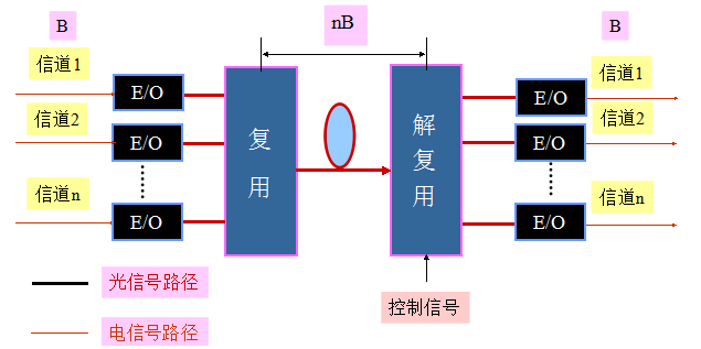 1310nm波長段和1550nm波長段一共約有200nm低損耗區(qū)可用,這相當于30000GHz的頻帶寬度。但在目前的實際光纖通信系統(tǒng)中由于光纖色散和調(diào)制速率的限制,單信道TDM系統(tǒng)的通信速率被限制在10Gbit/s或以下,所以單模光纖尚有絕大部分的帶寬資源有待開發(fā)。