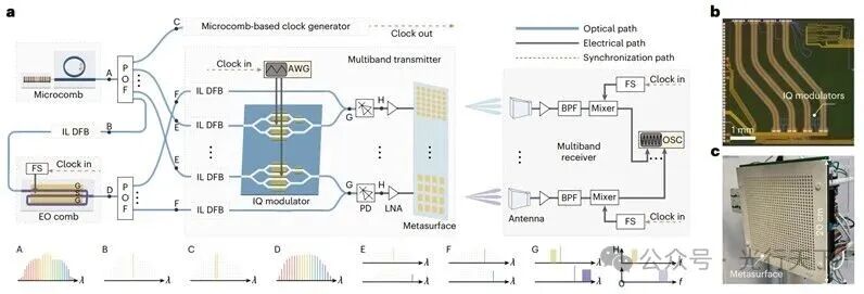 ICC訊 近日,北京大學電子學院常林研究員團隊與宋令陽教授、邸博雅研究員團隊合作在頂級學術期刊《自然·光子學》(Nature Photonics)在線發(fā)表了題為“Multiband wireless systems based on microwave integrated photonics with metasurfaces”的研究文章。該團隊在世界上首次提出了一種可擴展的統(tǒng)一平臺,通過將光子集成電路與電磁超表面相結合,成功實現(xiàn)了支持從2G到6G及以上不同頻段移動系統(tǒng)的并行無線通信架構。這一突破不僅打破了多頻段硬件集成的壁壘,還為未來大規(guī)模無線系統(tǒng)的降本增效提供了基礎性方案。