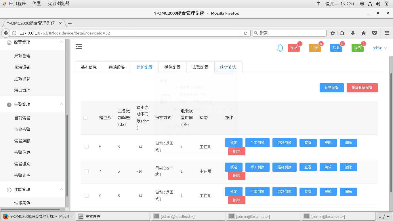 4.3、網(wǎng)管系統(tǒng)可正常完成告警測試,如下圖,半有源設(shè)備網(wǎng)管可以支持查看當(dāng)前告警,歷史告警,也可以對某些告警進(jìn)行屏蔽處理。