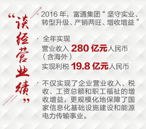在剛剛過去的2016年,富通集團(tuán)"堅守實業(yè)、轉(zhuǎn)型升級、產(chǎn)銷兩旺、增收增益",全年實現(xiàn)營業(yè)收入280億元人民幣(含海外),實現(xiàn)利稅19.8億元人民幣,不僅實現(xiàn)了企業(yè)營業(yè)收入、稅收、工資總額和職工福祉的增收增益,更規(guī)?;乇U狭藝倚畔⒒A(chǔ)設(shè)施建設(shè)和能源電力傳輸事業(yè)。