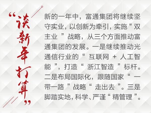 如何積極把握光通信產(chǎn)業(yè)的歷史機(jī)遇?談及這個話題,王建沂說,在他看來,富通集團(tuán)作為互聯(lián)網(wǎng)基礎(chǔ)傳輸材料的光纖通信企業(yè),在未來5年乃至10年的發(fā)展,將處于一個景氣的上升通道。具體落實到2017年,富通集團(tuán)還要建立更科學(xué)嚴(yán)謹(jǐn)精細(xì)的內(nèi)部管理制度,向管理要效益。