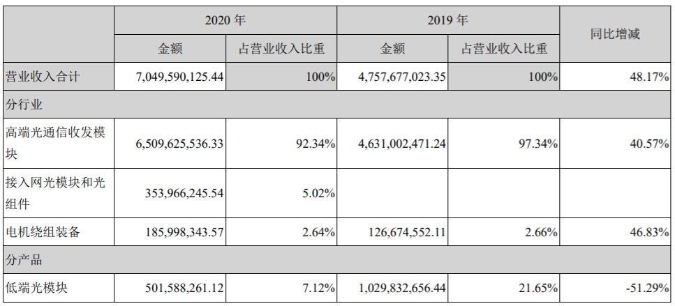 ICC訊(編輯:Aiur)4月26日晚間,中際旭創(chuàng)股份有限公司(簡稱中際旭創(chuàng))發(fā)布2020年度報告,報告期內(nèi),公司實現(xiàn)營業(yè)收入7,049,590,125.44元,同比增長48.17%,凈利潤865,483,550.47元,同比增長68.55%。中際旭創(chuàng)2020年業(yè)績主要受益于流量的快速增長以及海外重點客戶加大資本開支投入和批量部署400G機會。同時,國內(nèi) 5G網(wǎng)絡(luò)建設(shè)的快速推進帶來了5G光模塊需求的增長。
