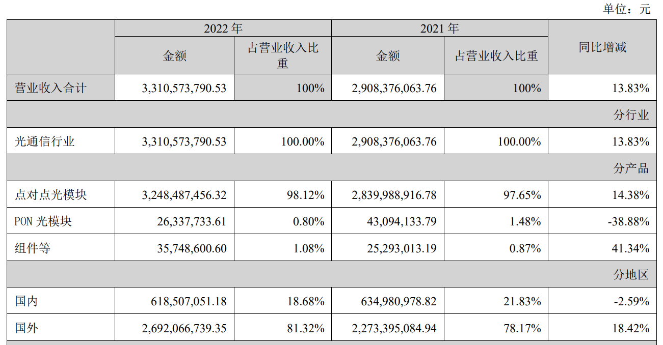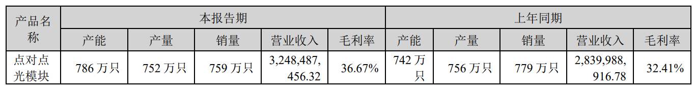 公告指出,新易盛產品在高速率光模塊營業(yè)收入較上年同期持續(xù)增長,凈利潤較上年同期持續(xù)保持增長。2022年,公司點對點光模塊銷量達到759萬只,營收貢獻達32.48億元,毛利率達36.67%,上年同期銷量達779萬只,營收貢獻達28.40億元,毛利率為32.41%。