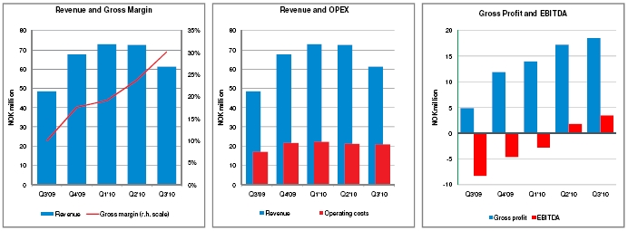 2010年第三季度銷售收入為6120萬挪威克朗,同比增長26%。由于季節(jié)性的下降,相比上個季度的7260萬挪威克朗有所下降。