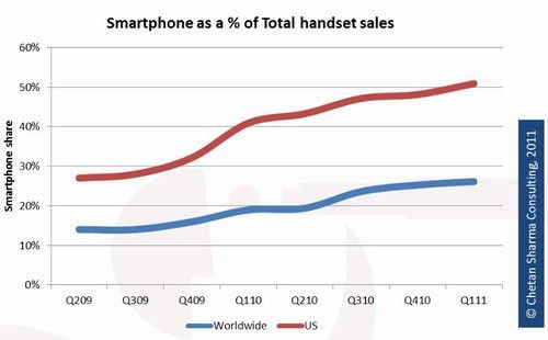 智能手機(jī)用戶占手機(jī)總用戶的26%。美國已突破新購手機(jī)中50%為