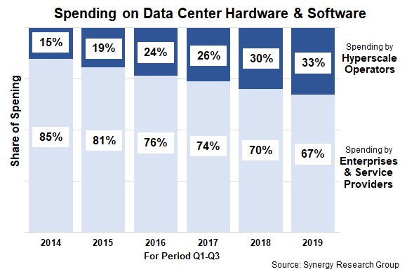ICCSZ訊(編譯:Nina)Synergy Research的最新數(shù)據(jù)顯示,2019年前三季度,超大規(guī)模運(yùn)營(yíng)商(Hyperscale Operators)占數(shù)據(jù)中心硬件和軟件總支出的33%,高于2017年前三季度的26%和2014年前三季度的15%。超大規(guī)模運(yùn)營(yíng)商包括IaaS、PaaS、SaaS、搜索、社交網(wǎng)絡(luò)和電子商務(wù)領(lǐng)域的全球最大提供商。