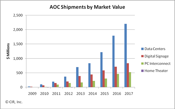 預(yù)測(cè)有源光纜(AOC)市場(chǎng)2011年的收益將達(dá)到幾近6,000萬(wàn)美元。尤其是InfiniBand市場(chǎng)等的數(shù)據(jù)中心銷售額占AOC市場(chǎng)收益的大半。預(yù)估今后5年CIR之全球AOC市場(chǎng)將達(dá)到19億美元規(guī)模。