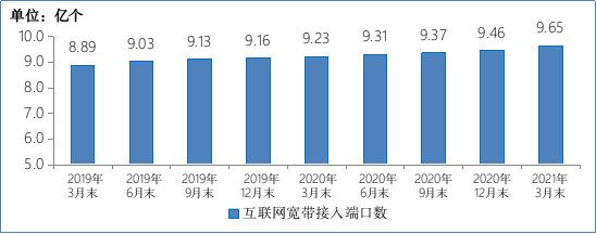 圖9 2019-2021年3月末互聯(lián)網(wǎng)寬帶接入端口數(shù)發(fā)展情況