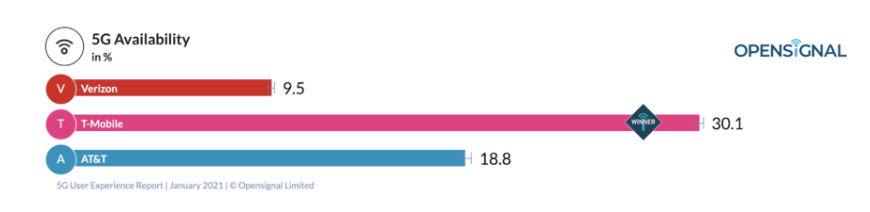 據(jù)悉,Opensignal這一調(diào)查結(jié)果源于其對2020年9月至12月期間上億部終端設(shè)備在美國各家主要電信運營商網(wǎng)絡(luò)上使用情況的分析?;谶@些數(shù)據(jù),T-Mobile US打敗了另外兩家運營商Verizon和AT&T,以58.1Mbps的5G平均下載速度領(lǐng)先。而在2020年6月當(dāng)時,T-Mobile US的5G平均下載速度為49.2Mbps。