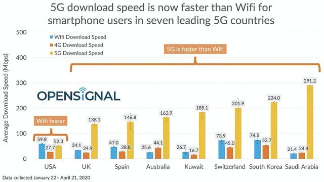 Opensignal在今年1月22日到4月21日期間實(shí)測(cè)了美國(guó)、韓國(guó)、英國(guó)、瑞士、澳大利亞、西班牙、科威特與沙特阿拉伯共8國(guó)的5G上網(wǎng)平均速度,并與4G、WiFi上網(wǎng)速度作比較。