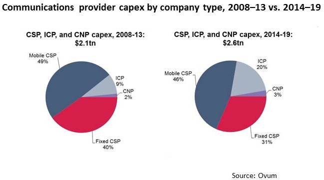 ICP資本開(kāi)支的增長(zhǎng)將逐漸主導(dǎo)整體支出走勢(shì)。例如,Ovum預(yù)測(cè),到2019年,固網(wǎng)和移動(dòng)