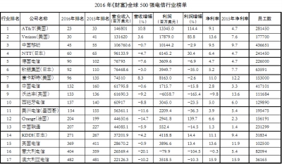 2016年全球共有17家電信企業(yè)上榜,較上年減少1家,原因是衛(wèi)星服務(wù)提供商DirecTV被美國電信運營商AT&T收購。已經(jīng)連續(xù)上榜22年的AT&T依然雄踞電信行業(yè)首位,美國Verizon和中國移動緊隨其后。榜單前7位同去年座次完全一樣,中國電信躍升至行業(yè)第8位導(dǎo)致之后的排名與去年略有不同。從總排名來看,13家電信企業(yè)排名上升,上升幅度最大的英國電信名次提前了42位。4家企業(yè)總排名下滑,降幅最大的意大利電信滑落了45個位次。我國三家運營商排名均有所提升,中國移動排名第45位,較上年上升10個位次;中國電信排名第132位,較上年提升28位;中國聯(lián)通排名第207位,較上年提升20位。