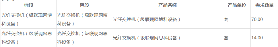 第1標段:光纖交換機(級聯(lián)現(xiàn)網博科設備),采購數(shù)量70臺。