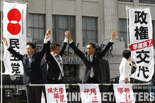 最大反對(duì)黨民主黨黨首鳩山由紀(jì)夫在大阪街頭亮相。民主黨先前調(diào)查發(fā)現(xiàn),預(yù)計(jì)選情最激烈的約30個(gè)選區(qū)中,大阪府內(nèi)差不多占8?jìng)€(gè),因此將這里作為重點(diǎn)戰(zhàn)場(chǎng)。