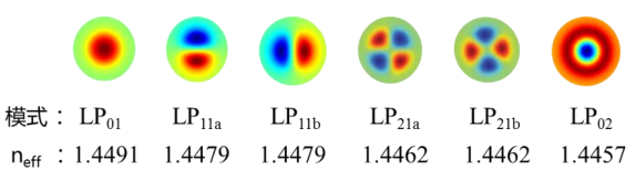 光子燈籠的實(shí)現(xiàn)是基于少模光纖的模式復(fù)用技術(shù),以少模光纖中幾個(gè)相互獨(dú)立的正交模式作為獨(dú)立的信道來(lái)成倍的提升光纖的通信容量,少模光纖不同模式傳遞信息如圖1所示。此外,少模光纖與單模光纖相比,模場(chǎng)面積更大,因此非線(xiàn)性效應(yīng)的容限也會(huì)相對(duì)提高。這樣既提高了傳輸容量,又提高了香農(nóng)極限,從而極大的提升了整個(gè)光纖通信系統(tǒng)的通信容量。