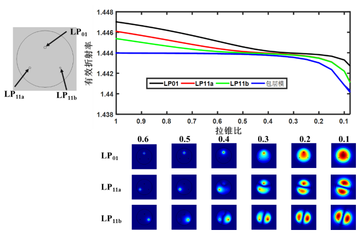以拉錐型三模選模光子燈籠為例闡述模式復(fù)用技術(shù):三模選模光子燈籠將三根單模光纖緊密對(duì)稱(chēng)的分布在折射率略低于光纖包層的玻璃套管里,然后對(duì)整個(gè)套管進(jìn)行拉錐處理,拉錐過(guò)程中單模光纖纖芯直徑逐漸減小,以至于激光大部分從纖芯泄漏到包層,纖芯與原有包層成為無(wú)效波導(dǎo)結(jié)構(gòu)。同時(shí),每根光纖的原有包層也和鄰近光纖的原有包層進(jìn)行熔合,逐漸形成新的導(dǎo)光纖芯,外層玻璃套管在拉錐的過(guò)程中變?yōu)樾碌陌鼘?,整體結(jié)構(gòu)形成新的纖芯/包層波導(dǎo)。光子燈籠的拉錐末端同少模光纖相連接,實(shí)現(xiàn)了多個(gè)基模向高階模的轉(zhuǎn)換,達(dá)到模式復(fù)用的效果。三模選模光子燈籠的有效折射率及模式演變?nèi)鐖D2所示。