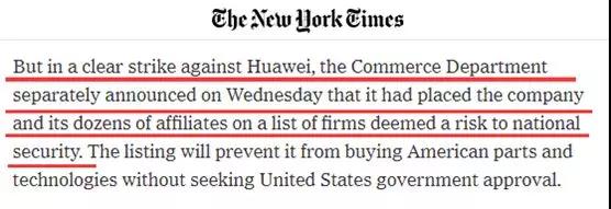 值得注意的是,雖然上圖中這份針對美國信息和通訊技術(shù)以及服務(wù)供應(yīng)鏈的總統(tǒng)令,在文本中并沒有點(diǎn)名中國或是華為,但根據(jù)美國《華盛頓郵報》和《紐約時報》的報道,美國商務(wù)部在今天該總統(tǒng)令生效的同時,還宣布他們已經(jīng)把華為公司及其眾多關(guān)聯(lián)公司列入了一個“會對美國國家安全構(gòu)成風(fēng)險”的名單中,這也就意味著華為無法從美國買到美國研發(fā)的技術(shù)。