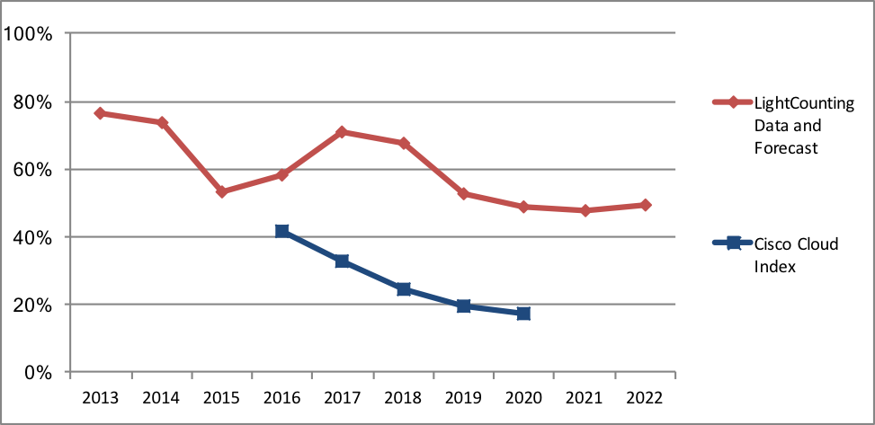 以下是LightCounting對(duì)云數(shù)據(jù)中心帶寬增長(zhǎng)率預(yù)測(cè)趨勢(shì),2016-2017年增長(zhǎng)十分明顯,曲線圖還包括思科2016年發(fā)布的云數(shù)據(jù)中心通信量增長(zhǎng)預(yù)測(cè)。問題之處在于曲線如何說明超大數(shù)據(jù)中心運(yùn)營商光器件需求可能產(chǎn)生的影響。