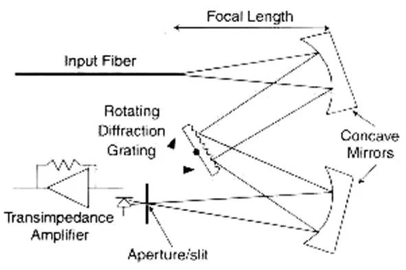 3、衍射光柵型光譜儀的工作原理當前光纖通信所使用的波段全部是在780nm到1650nm這一近紅外波段范圍之內(nèi),這就要求采用的光譜儀掃描波長范圍必須可以完全覆蓋這個波段。目前光譜調(diào)諧選擇主要有法布里-泊羅干涉法、邁克遜干涉法和衍射光柵( Diffraction Grating )法,這三種完全可以方便地覆蓋整個近紅外波段,而衍射光柵( DiffractionGrating )法以其覆蓋波長范圍寬、波長精度高、調(diào)諧方便和相對不太復雜的實現(xiàn)技術(shù)成為當今光通信用光譜分析儀的首選技術(shù)。圖三為衍射光柵( Diffraction Grating )型光譜儀的構(gòu)成原理圖。它的核心部件就是用于調(diào)諧的衍射光柵,基于衍射光柵光譜儀的示意圖如下圖四。