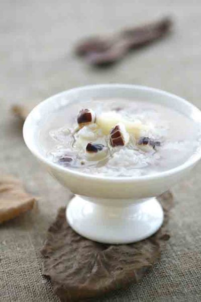 做法:將干銀耳20克浸泡,摘去蒂梗,洗凈,蒸30分鐘;鮮百合100克去蒂洗凈,香蕉2根去皮切片;將以上食材同放燉盅內(nèi),加枸杞、冰糖、水適量蒸30分鐘即可。