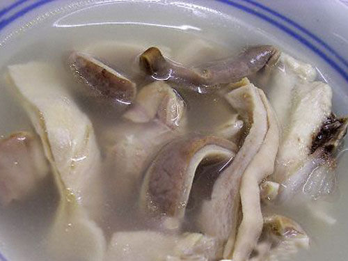 豬肚1具,白術(shù)60克,煨姜45克,胡椒15克,精鹽適量。將豬肚洗凈,去油脂,放入沸水中焯后去水,晾干水 后備用。將白術(shù)、煨姜、胡椒放入豬肚內(nèi),縫合豬肚,豬肚外以針刺小孔,放入清水,大火煮沸,小火煮2小時,放入精鹽調(diào)味。撈出豬肚,切塊,喝湯吃豬肚。有溫中散寒,補(bǔ)脾益氣的功效,尤其適用于脾胃虛寒的人。