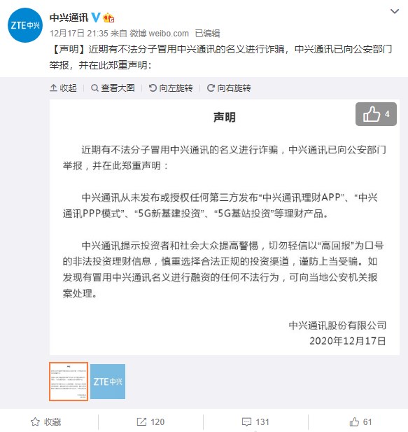 中興通訊稱,從未發(fā)布或授權(quán)任何第三方發(fā)布 “中興通訊理財 APP”、“中興通訊 PPP 模式”、“5G 新基建投資”、“5G