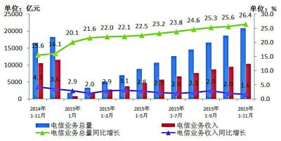 圖1 2014年~2015年11月電信業(yè)務(wù)總量與業(yè)務(wù)收入發(fā)展情況