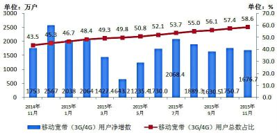圖2 2014年~2015年11月移動寬帶用戶當(dāng)月凈增數(shù)和總數(shù)占比情況