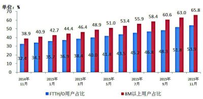 圖3 2014年~2015年11月光纖接入FTTH/O和8Mbps及以上寬帶用戶占比情況