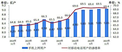 圖4 2014年~2015年11月手機上網(wǎng)用戶和對移動電話用戶滲透率情況