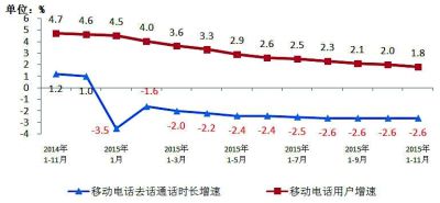 圖5 2014年~2015年11月移動電話通話量和移動電話用戶同比增長比較