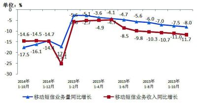 圖6 2014年~2015年11月移動短信業(yè)務(wù)量和移動短信收入同比增長情況