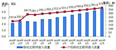 圖7 2014年~2015年11月移動互聯(lián)網(wǎng)接入流量和戶均流量比較