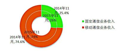 圖8 2015年11月電信業(yè)務(wù)收入結(jié)構(gòu)占比情況(固定和移動)