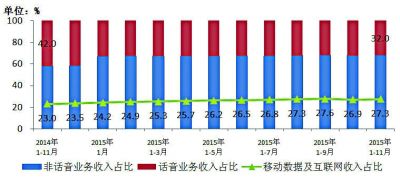 圖9 2014年~2015年11月話音、非話音、移動數(shù)據(jù)及互聯(lián)網(wǎng)收入占比情況