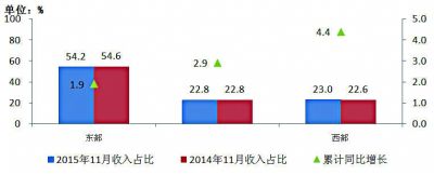 圖10 2015年11月東、中、西部電信主營業(yè)務(wù)收入同期比較