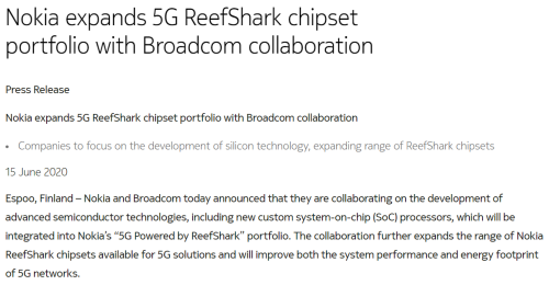 諾基亞已經(jīng)引進了芯片制造商Marvell,并于英特爾達成了一項新協(xié)議。本周一(6月15日),諾基亞宣布與博通合作開發(fā)先進的半導體技術(shù),包括將集成到諾基亞“ReefShark驅(qū)動的5G”產(chǎn)品組合中的新的定制系統(tǒng)級芯片(SoC)處理器。此次合作將進一步擴大諾基亞應(yīng)用于5G解決方案的ReefShark芯片組組合,并將提升5G網(wǎng)絡(luò)的系統(tǒng)性能和改善5G網(wǎng)絡(luò)的能耗。