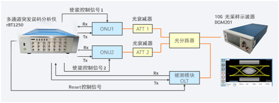 聯(lián)訊儀器專注于國產化高速光通信高端測試儀器和測試設備的研發(fā)和生產,于2019年推出了國產化10G突發(fā)誤碼儀產品rBT1250,適應中國用戶對批量生產成本的要求,目前已經(jīng)全面用于國內OLT模塊知名廠家10G及10G以下速率突發(fā)靈敏度測試?;趓BT1250多通道突發(fā)誤碼儀,OLT光模塊突發(fā)靈敏度測試方案更加簡單和高效,如下圖所示: