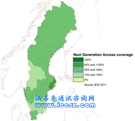 《2011歐洲寬帶覆蓋》調(diào)研報(bào)告顯示,瑞典基本寬帶覆蓋率(至少提供144kbps的服務(wù),只要他們?cè)敢猓┻_(dá)99%,超高速寬帶(也稱為NGA,即下一代接入)覆蓋接近51%。在調(diào)研的29個(gè)國(guó)家中(歐盟27國(guó)和挪威、冰島),96%能夠獲得基本寬帶,超過50%(一半國(guó)家走向2020數(shù)字天堂目標(biāo))能夠獲得超高速。