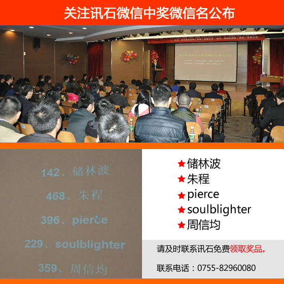 至此,整個(gè)室內(nèi)活動完全告一段落。其中,中間還穿插了“關(guān)注訊石微信中獎”的活動,為現(xiàn)場抽取5名幸運(yùn)嘉賓,只可惜中獎微信號均不在現(xiàn)場,可以說,整個(gè)抽獎過程中,微信抽獎的氣氛最為火爆、新潮。中獎的五名微信用戶如下:儲林波、朱程、pierce、soulblinghter、周信均,還望中獎用戶及時(shí)聯(lián)系訊石領(lǐng)取獎品,領(lǐng)獎日期截至2014年1月20日。