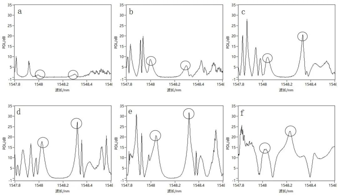 光纖光柵(FBG)在沒有壓力時中心波長附近光波段的PDL趨近于零,施加壓力后中心波長附近兩端出現(xiàn)兩個波峰(圖中畫圈的位置),隨著壓力逐漸增大,波峰峰值越來越大,在壓力達(dá)到60KN時波峰出現(xiàn)最大值,且隨著壓力增大兩個波峰逐漸靠近,中間PDL趨近于零的平坦區(qū)域逐漸縮小,在壓力達(dá)到100KN時波峰出現(xiàn)畸變,波峰高度有所降低,中間PDL平坦區(qū)域消失。