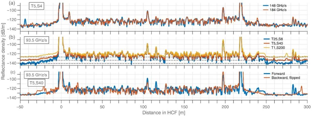 圖3描述了為驗(yàn)證數(shù)據(jù)解釋的有效性而進(jìn)行的測(cè)試的結(jié)果。在圖3(a)中,改變掃描的重復(fù)率以增加啁啾率?? 在不改變空間分辨率的情況下。在頻域中,這種修改具有將散射信號(hào)擴(kuò)展到更大帶寬的效果,從而導(dǎo)致與來自儀器的噪聲的相對(duì)偏移。一致的頻譜結(jié)構(gòu)表明,在嵌套的抗共振無節(jié)點(diǎn)光纖(0-219 m)范圍內(nèi),加性、相位和強(qiáng)度噪聲比散射信號(hào)弱。在圖3(b)中,以不同的方式對(duì)圖2使用的數(shù)據(jù)進(jìn)行平均,在時(shí)間平均和頻譜平均之間進(jìn)行權(quán)衡。在大多數(shù)散射區(qū)域,軌跡的最低點(diǎn)遵循預(yù)測(cè)的測(cè)量噪聲下限(虛線為-127、-134和-141 dB/m),其水平隨時(shí)間平均值的增加而降低,證實(shí)了加性噪聲模型的一般有效性。同時(shí),記錄道的最高點(diǎn)保持在恒定水平,這表明后向散射信號(hào)是可重復(fù)的,正如靜態(tài)表面粗糙度引起的散射所預(yù)期的那樣。最后,在圖3(c)中,從相反方向照亮嵌套的反諧振無節(jié)點(diǎn)光纖樣品并在后處理中翻轉(zhuǎn)測(cè)量的反射密度,以顯示與同一拼接的距離。雖然由于尾纖的移動(dòng)和修改的極化發(fā)射條件而不完善,但兩條記錄道之間存在合理的一致性。這證實(shí)了一個(gè)解釋,即中間峰是由局部斷層而不是噪聲引起的。