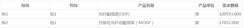 招標(biāo)內(nèi)容: 本項目為集中招標(biāo)項目。本次采購光纖配線架產(chǎn)品共計約10.06萬架、光纖總配線架產(chǎn)品共計約1.71萬架,采購滿足期為1年。實際采購量以采購合同為準(zhǔn)。