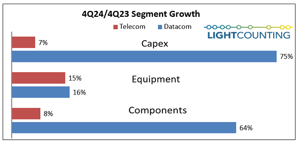 下圖展示了整個行業(yè)供應(yīng)鏈的增長情況,分為電信和數(shù)據(jù)通信兩大垂直領(lǐng)域。這一次,所有數(shù)據(jù)均為正數(shù)。電信市場在經(jīng)歷了平淡無奇的一年后,憑借強(qiáng)勁的第四季度收官,主要得益于北美服務(wù)提供商的支出增加。部分反彈具有季節(jié)性,但多家設(shè)備和器件供應(yīng)商評論稱,電信需求持續(xù)復(fù)蘇的跡象明顯。